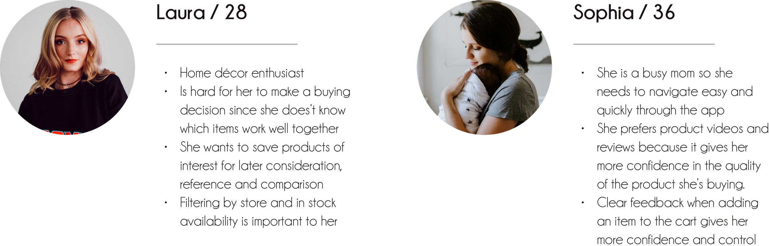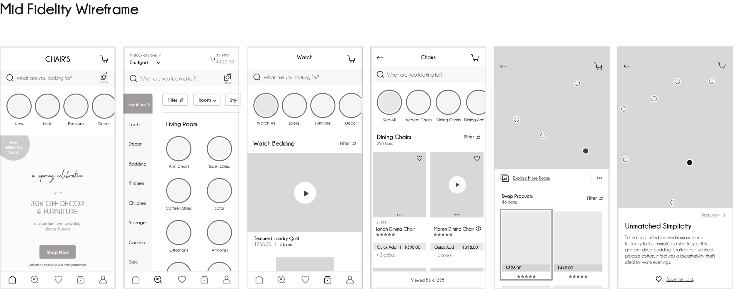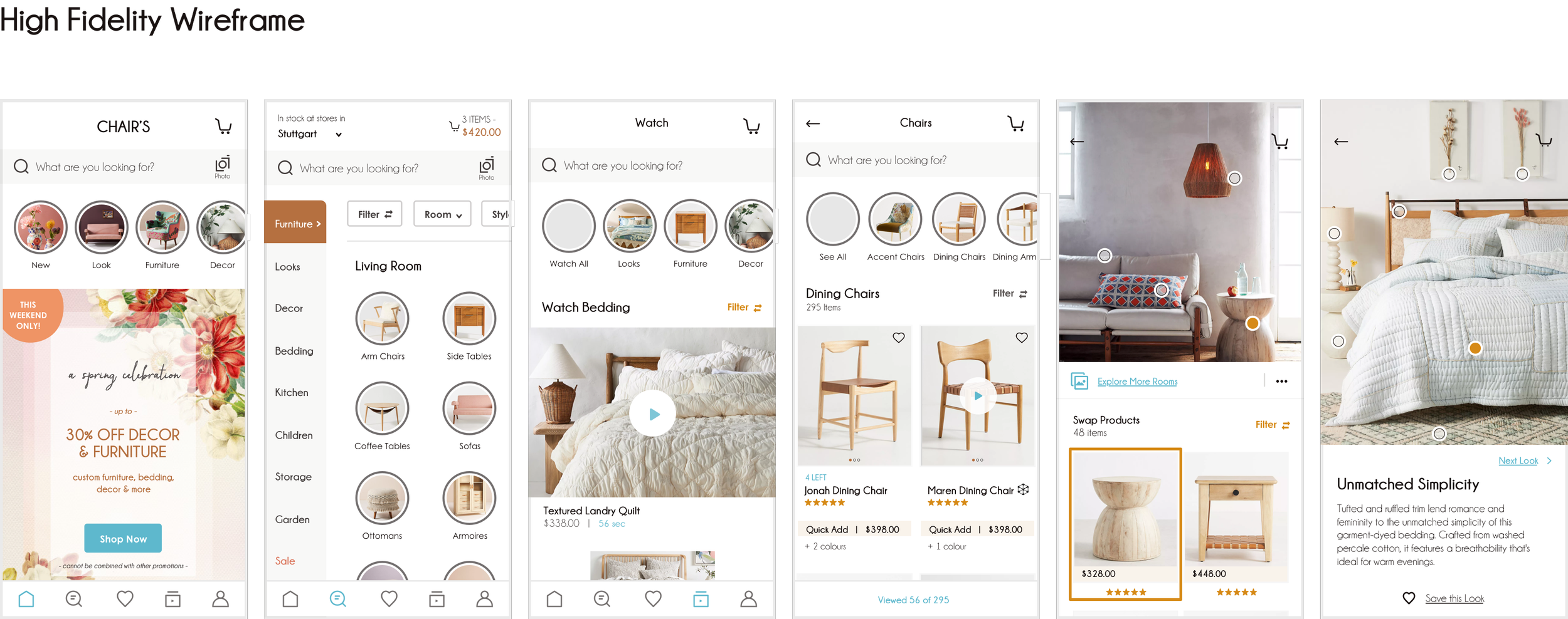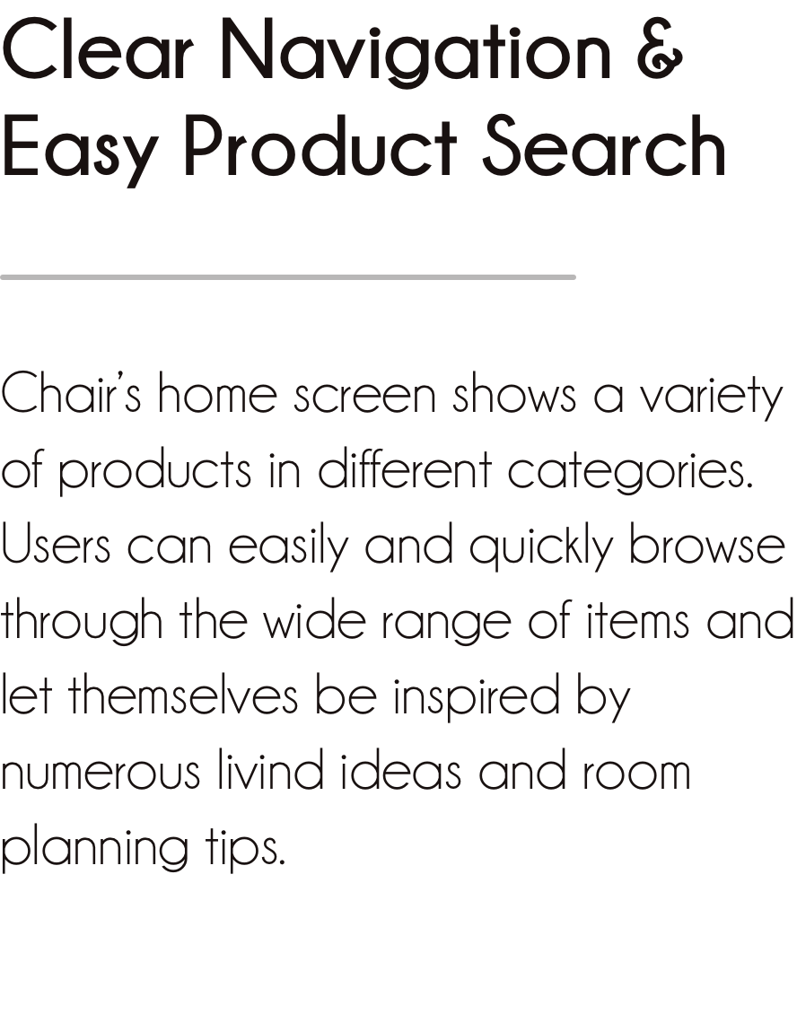What started as an idea from my own needs when buying furniture has turned into a native app that offers a personalised experience to online furniture shoppers. The multitude of personalised room designs examples and the ease with which to find them, gives users the chance to get inspired and find an answer to their questions. Though momentarily still a prototype, users who tested it said they would love to explore