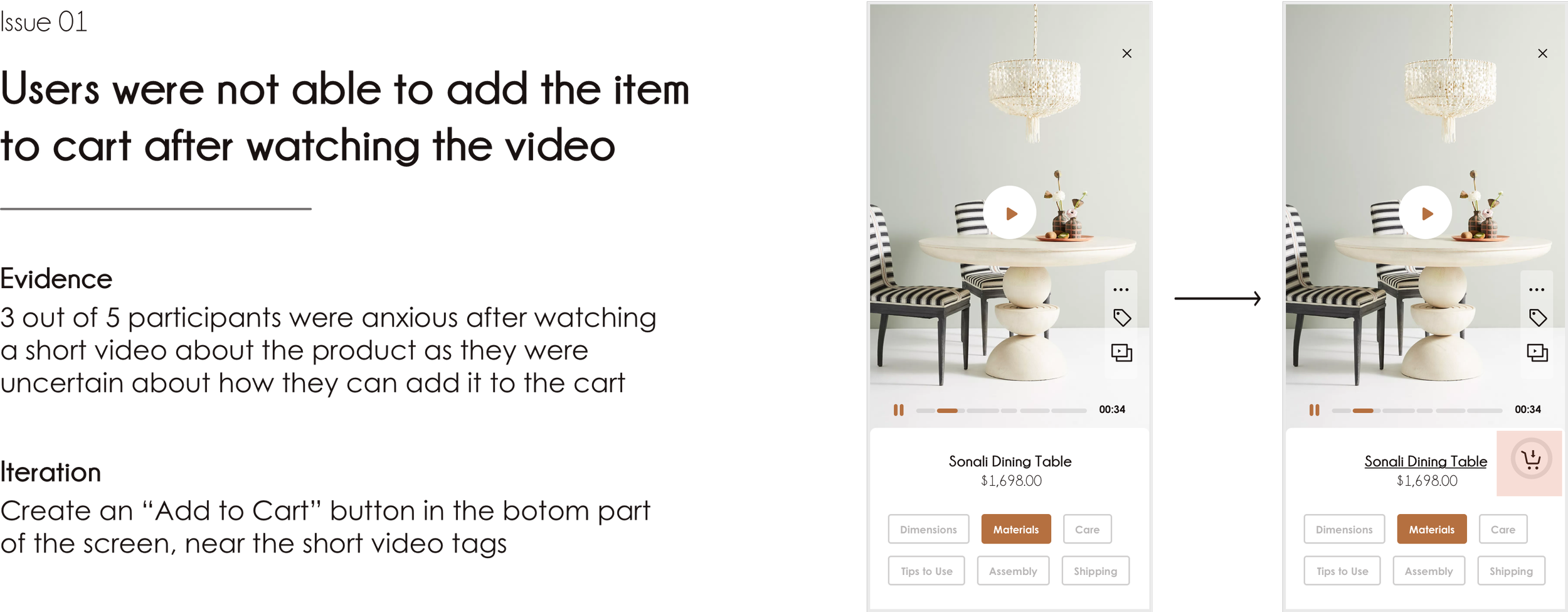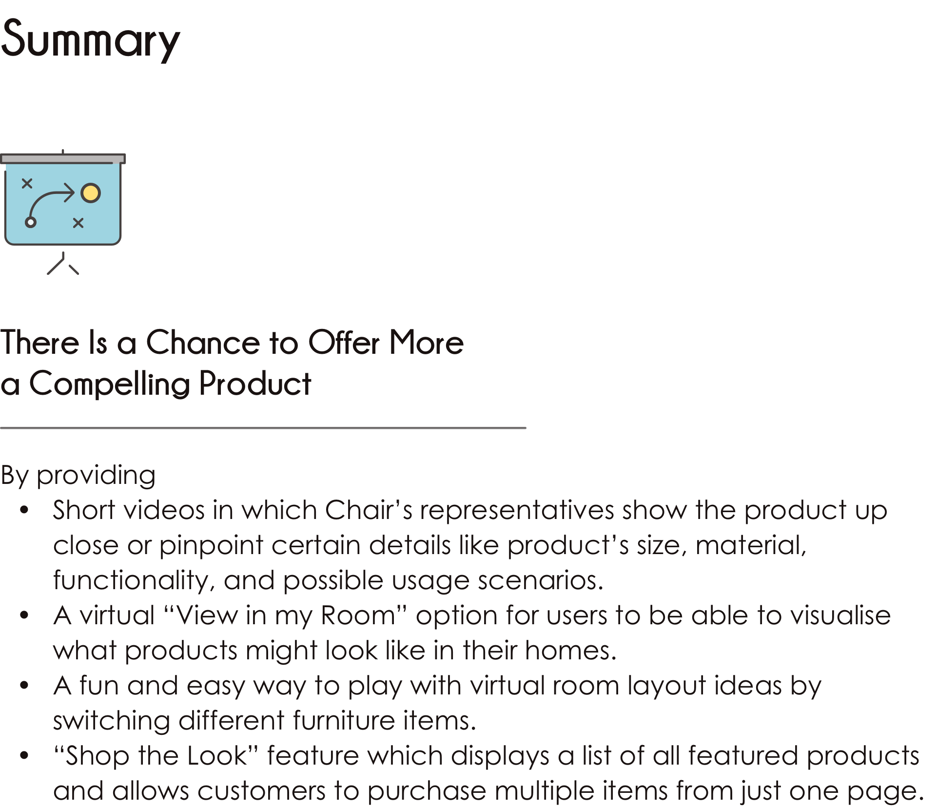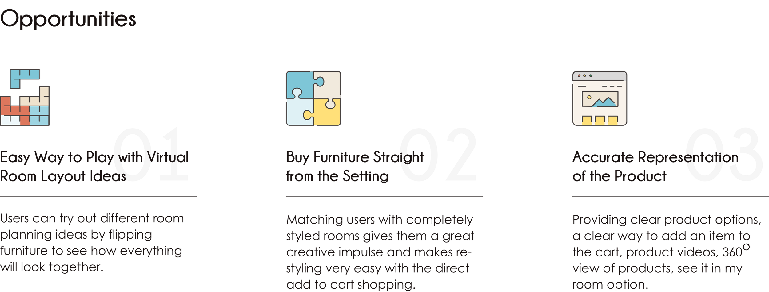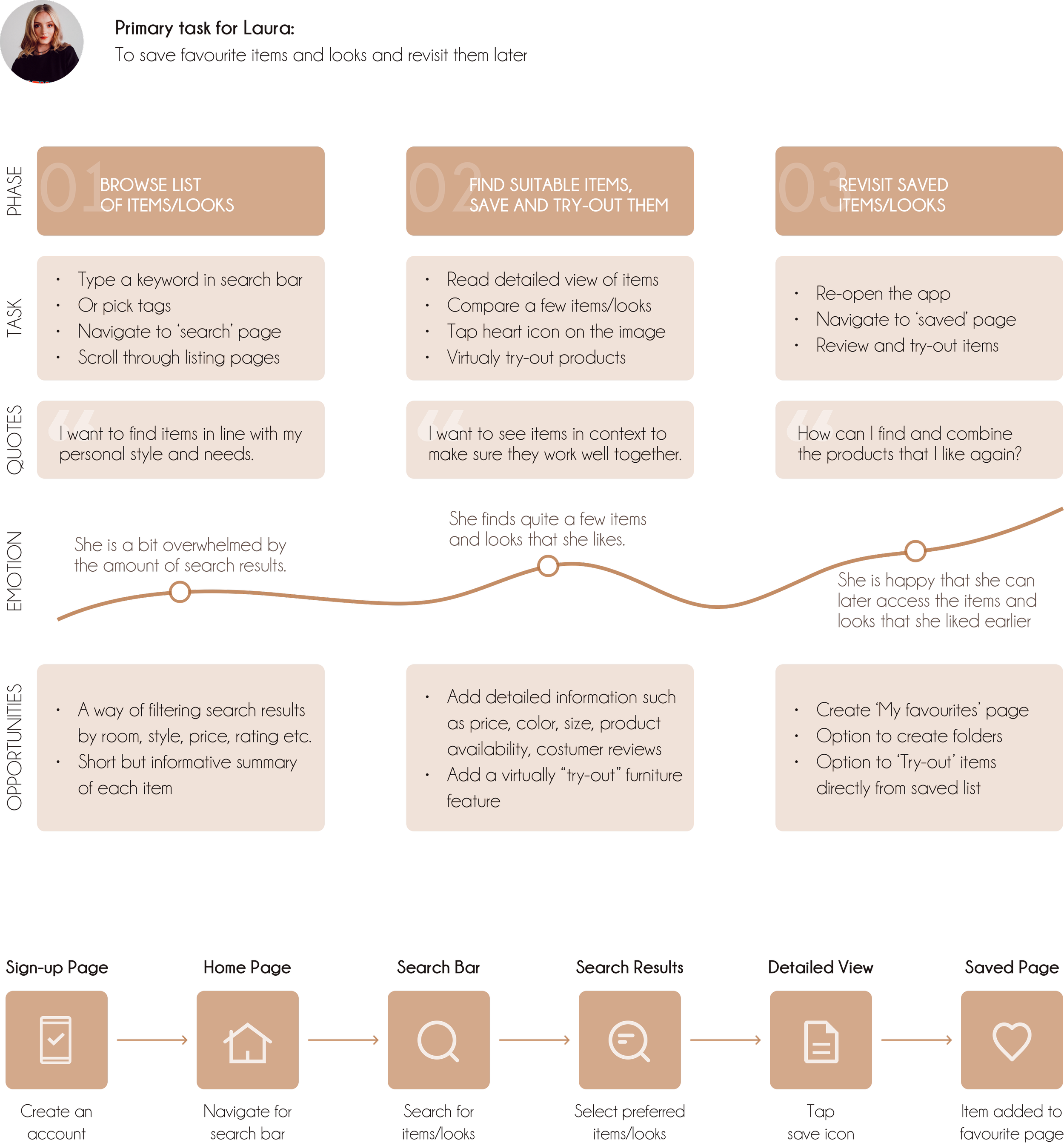 What started as an idea from my own needs when buying furniture has turned into a native app that offers a personalised experience to online furniture shoppers. The multitude of personalised room designs examples and the ease with which to find them, gives users the chance to get inspired and find an answer to their questions. Though momentarily still a prototype, users who tested it said they would love to explore